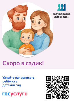 Скоро в садик! Уважаемые родители! Чтобы записать ребенка в детский сад через портал Госуслуги, наведите камеру на Qr код.